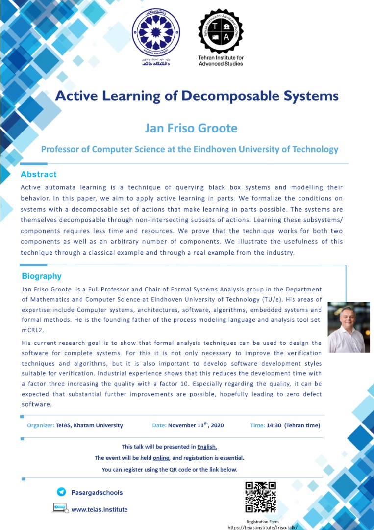 Jan Friso Groote is a Full Professor and Chair of Formal Systems Analysis group in the Department of Mathematics and Computer Science at Eindhoven University of Technology (TU/e). His areas of expertise include Computer systems, architectures, software, algorithms, embedded systems and formal methods. He is the founding father of the process modeling language and analysis tool set mCRL2. His current research goal is to show that formal analysis techniques can be used to design the software for complete systems. For this it is not only necessary to improve the verification techniques and algorithms, but it is also important to develop software development styles suitable for verification. Industrial experience shows that this reduces the development time with a factor three increasing the quality with a factor 10. Especially regarding the quality, it can be expected that substantial further improvements are possible, hopefully leading to zero defect software.
