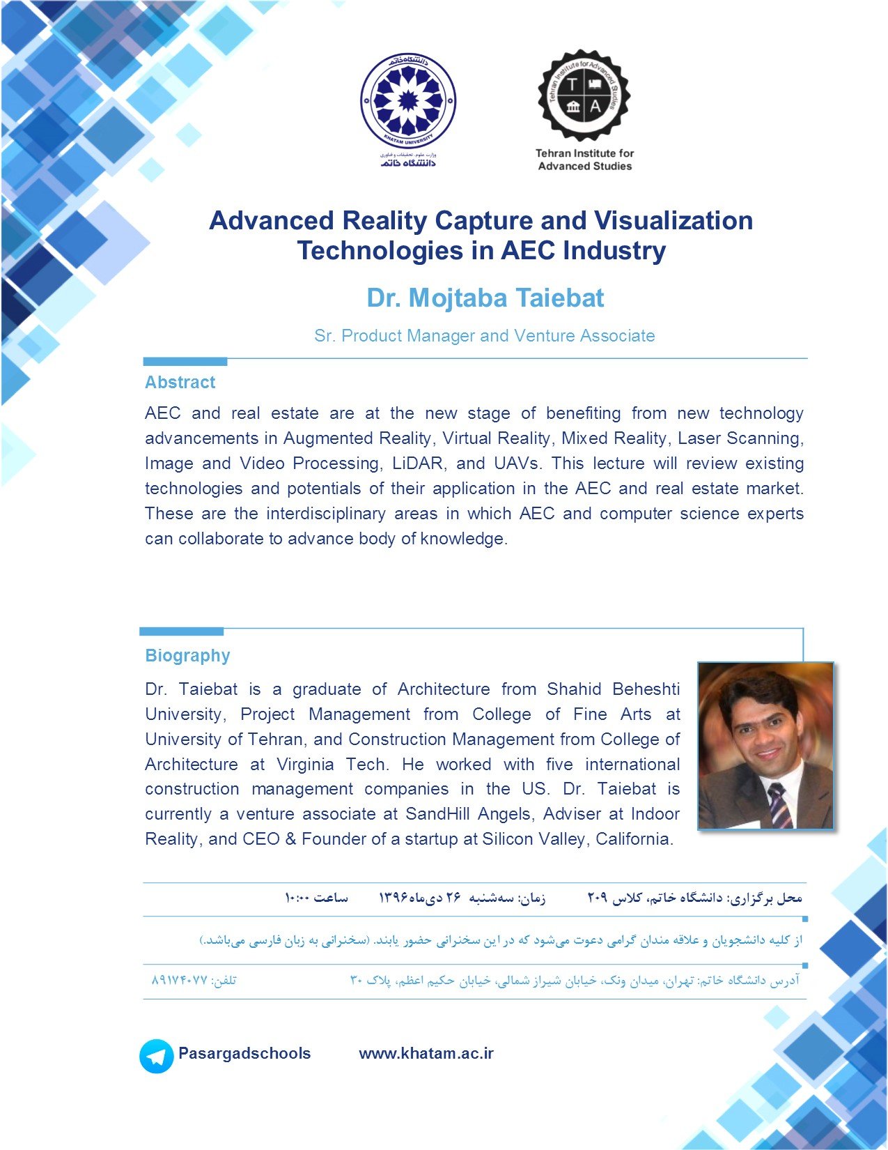 Dr. Taiebat is a graduate of Architecture from Shahid Beheshti University, Project Management from College of Fine Arts at University of Tehran, and Construction Management from College of Architecture at Virginia Tech. He worked with five international construction management companies in the US. Dr. Taiebat is currently a venture associate at SandHill Angels, Adviser at Indoor Reality, and CEO & Founder of a startup at Silicon Valley, California.
