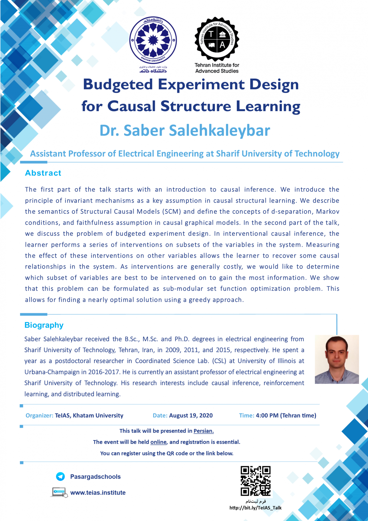 Saber Salehkaleybar received the B.Sc., M.Sc. and Ph.D. degrees in electrical engineering from Sharif University of Technology, Tehran, Iran, in 2009, 2011, and 2015, respectively. He spent a year as a postdoctoral researcher in Coordinated Science Lab. (CSL) at University of Illinois at Urbana-Champaign in 2016-2017. He is currently an assistant professor of electrical engineering at Sharif University of Technology. His research interests include causal inference, reinforcement learning, and distributed learning.