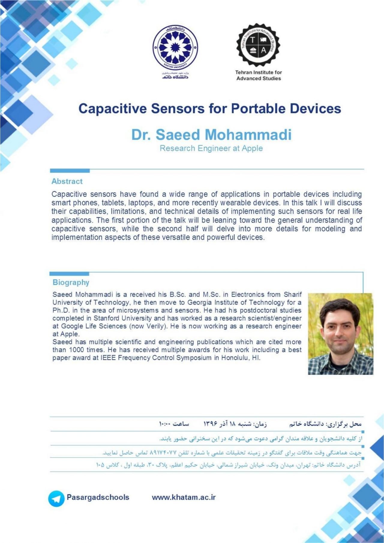 Capacitive sensors have found a wide range of applications in portable devices including smart phones, tablets, laptops, and more recently wearable devices. In this talk I will discuss their capabilities, limitations, and technical details of implementing such sensors for real life applications. The first portion of the talk will be leaning toward the general understanding of capacitive sensors, while the second half will delve into more details for modeling and implementation aspects of these versatile and powerful devices.