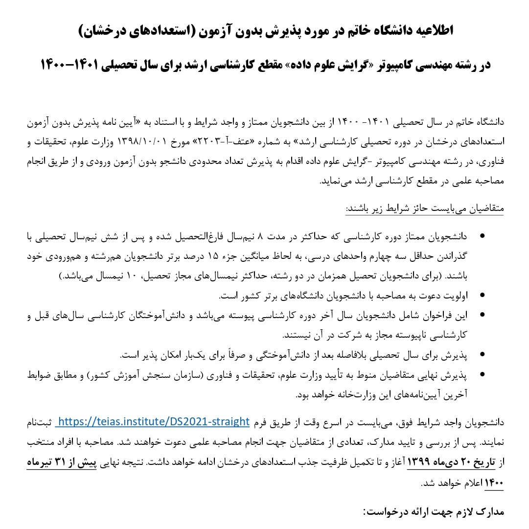 Announcement Data Science 2021 Admission khatam.teias@gmail.com +982189174611 Overview Tehran Institute for Advanced Studies admits a limited number of excellent and qualified students without entrance exam (Konkoor) through scientific interview in academic year 2021-22 (1400-01) in the field of Data Science. Click here to find more information about requirements and program specifications. Register