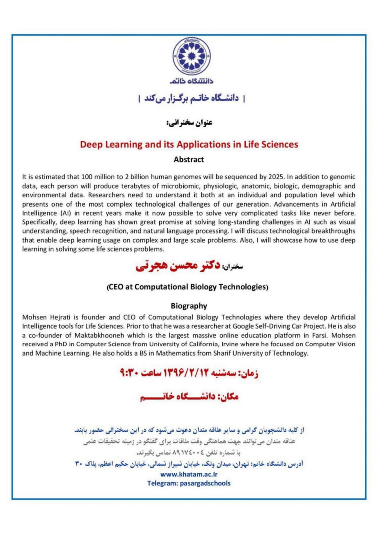 Mohsen Hejrati is founder and CEO of Computational Biology Technologies where they develop Artificial Intelligence tools for Life Sciences. Prior to that he was a researcher at Google Self-Driving Car Project. He is also a co-founder of Maktabkhooneh which is the largest massive online education platform in Farsi. Mohsen received a PhD in Computer Science from University of California, Irvine where he focused on Computer Vision and Machine Learning. He also holds a BS in Mathematics from Sharif University of Technology.