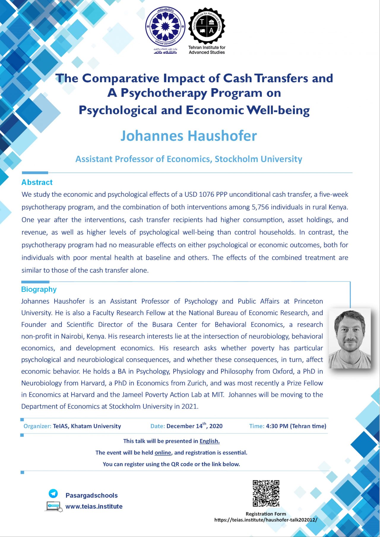 Johannes Haushofer was an Assistant Professor of Psychology and Public Affairs at Princeton University. He is also a Faculty Research Fellow at the National Bureau of Economic Research, and Founder and Scientific Director of the Busara Center for Behavioral Economics, a research non-profit in Nairobi, Kenya. His research interests lie at the intersection of neurobiology, behavioral economics, and development economics. His research asks whether poverty has particular psychological and neurobiological consequences, and whether these consequences, in turn, affect economic behavior. He holds a BA in Psychology, Physiology and Philosophy from Oxford, a PhD in Neurobiology from Harvard, a PhD in Economics from Zurich, and was most recently a Prize Fellow in Economics at Harvard and the Jameel Poverty Action Lab at MIT. Johannes will be moving to the Department of Economics at Stockholm University in 2021.