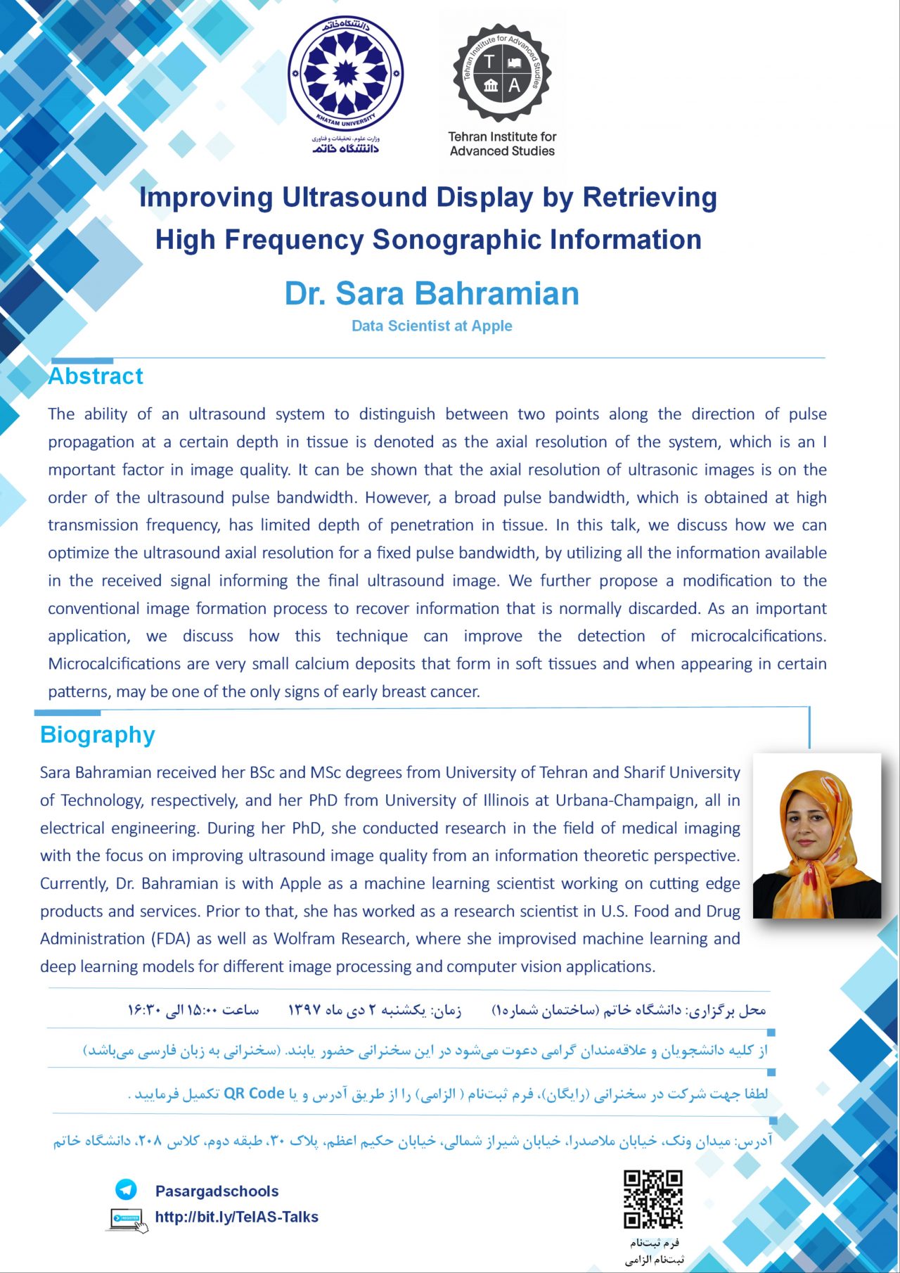 Sara Bahramian received her BSc and MSc degrees from University of Tehran and Sharif Universiy of Technology, respectively, and her PhD from University of Illinois at Urbana-Champaign, all in electrical engineering. During her PhD, she conducted research in the field of medical imaging with the focus on improving ultrasound image quality from an information theoretic perspective. Currently, Dr. Bahramian is with Apple as a machine learning scientist working on cutting edge products and services. Prior to that, she has worked as a research scientist in U.S. Food and Drug Administration (FDA) as well as Wolfram Research, where she improvised machine learning and deep learning models for different image processing and computer vision applications.