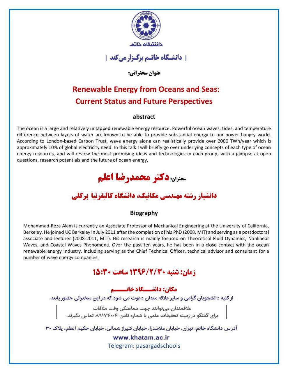 The ocean is a large and relatively untapped renewable energy resource. Powerful ocean waves, tides, and temperature difference between layers of water are known to be able to provide substantial energy to our power hungry world. According to London-based Carbon Trust, wave energy alone can realistically provide over 2000 TWh/year which is approximately 10% of global electricity need. In this talk I will briefly go over underlying concepts of each type of ocean energy resources, and will review the most promising ideas and technologies in each group, with a glimpse at open questions, research potentials and the future of ocean energy.