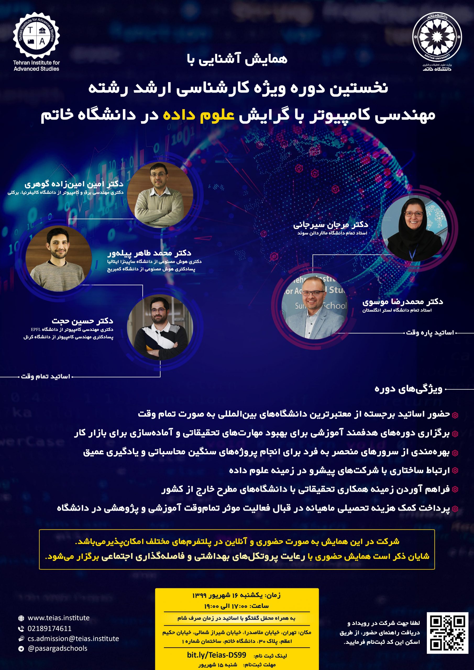Please join us in this event on September 6th, 2020 to learn more about the new Special MSc Program in Data Science. Faculty members will be present in this Meeting to tell you all about TeIAS and this Master’s Program and address your further questions. Also, there is a unique opportunity provided to dine with the professors and current students of TeIAS to discuss and address all your concerns and questions. You can register by clicking on the Register Button on the left side of the page.